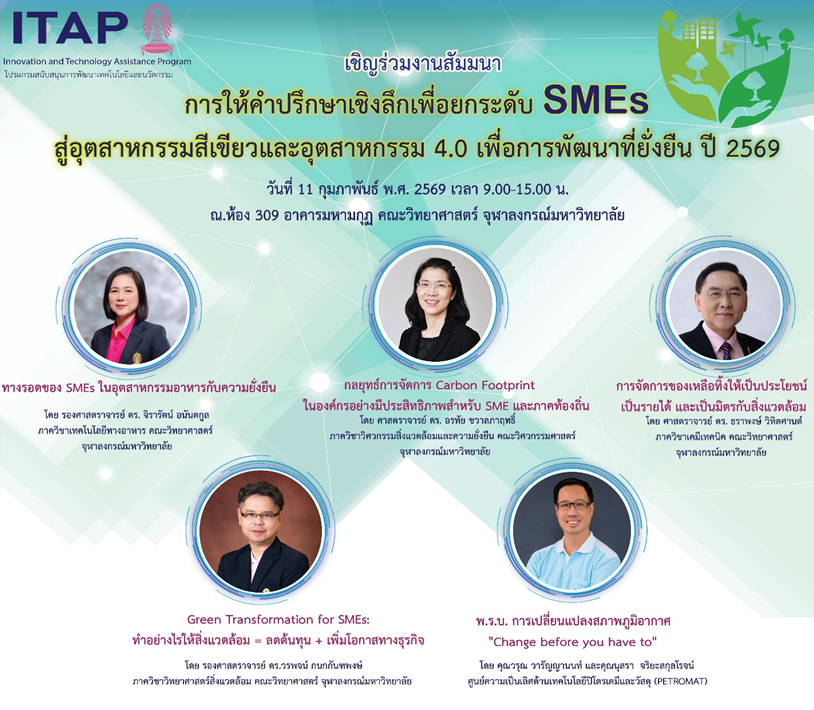 Seminar : สัมมนา “โครงการการให้คำปรึกษาเชิงลึกเพื่อยกระดับ SMEs สู่อุตสาหกรรมสีเขียวและอุตสาหกรรม 4.0 เพื่อการพัฒนาที่ยั่งยืน ปี 2569 (ITAP_CHULA) เสวนาหัวข้อ “จากความท้าทายสู่โอกาสใหม่ของ SMEs ด้วยนวัตกรรมและการจัดการสิ่งแวดล้อม” จากผู้ประกอบการชั้นนำ